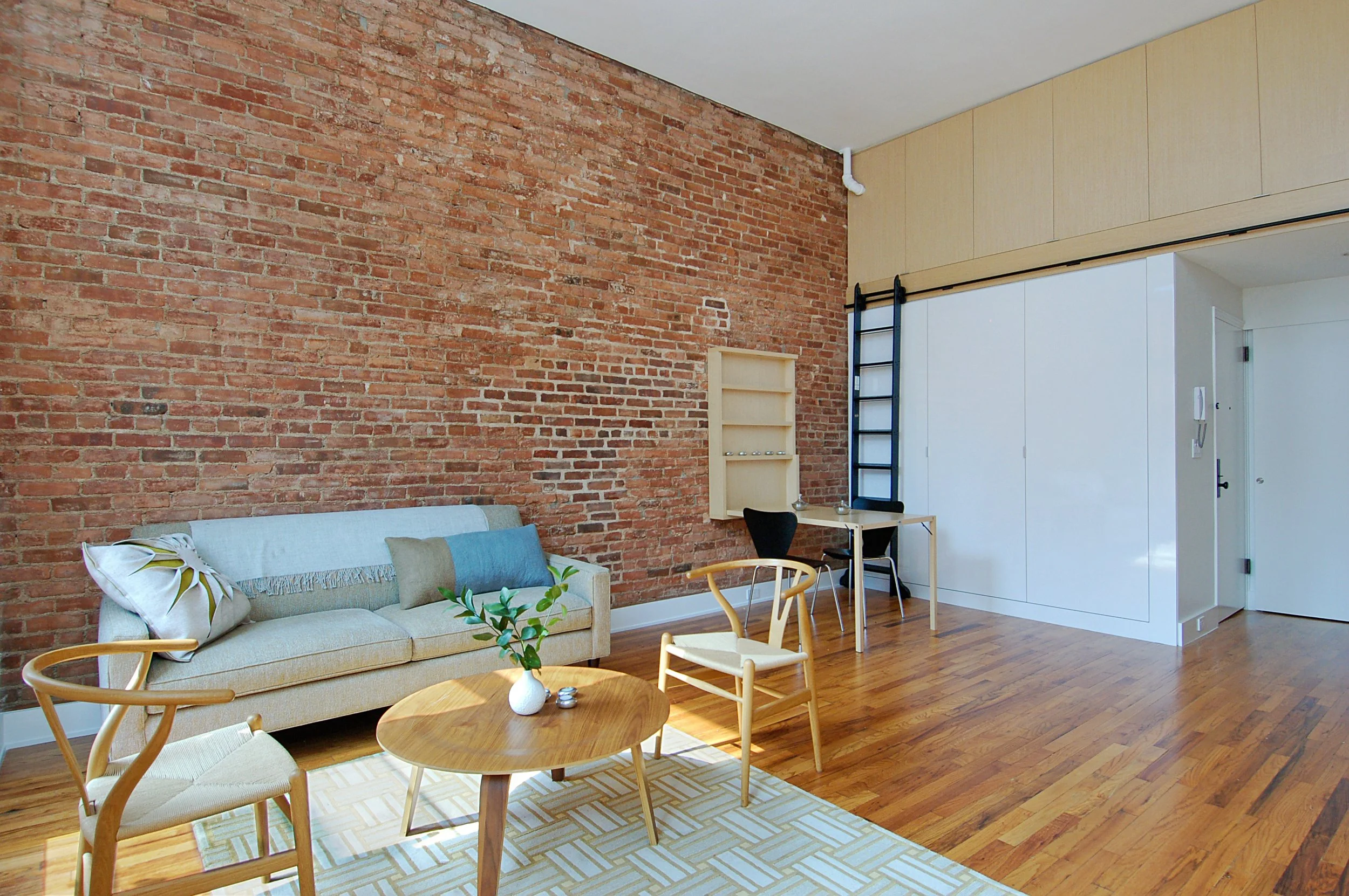 Blesso Properties customized each of the studio units with a program of craft finishes, efficiency and convertibility. Features include murphy beds, a dining table for five that folds into the wall, stackable chairs designed to fit in an adjacent closet, rolling library ladders to access copious built-in storage and individual washer/dryers in every unit.